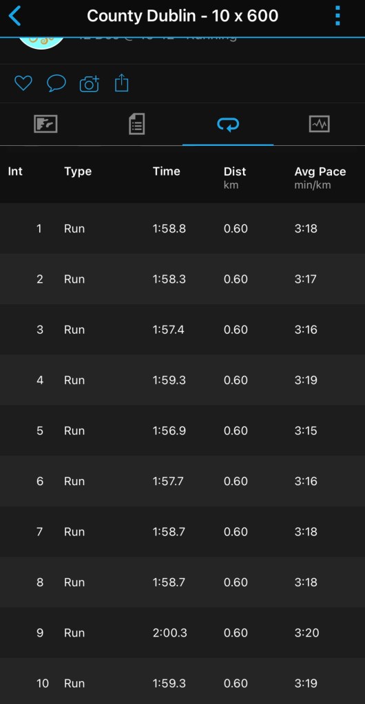 Now to the training, with the excuses out of the way. Tuesday’s session of 10 x 600m was really fun. There is a 600m flat cycle lane across the road from my office that I had eyed up for this session. I was doing it after work but the traffic on the cycle lane is manageable and I didn’t really encounter any issues. There was a decent headwind on the even splits but overall I was pretty consistent in the reps. It’s good to get the legs tipping over a bit quicker and overall I felt pretty strong and not under any pressure with my breathing.