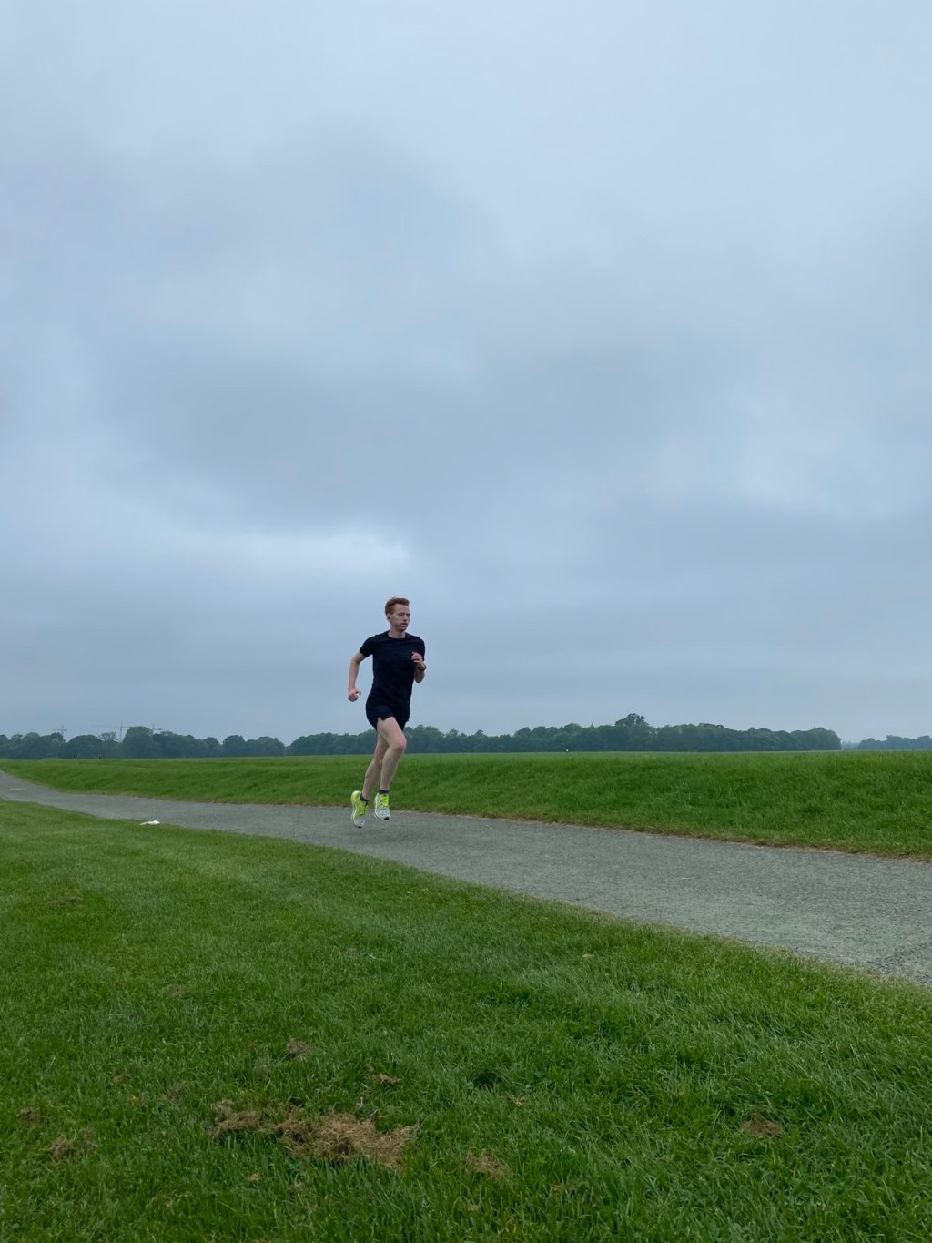 Saturday’s session was the same as last week and unfortunately it was not executed as well. The laps of the Acres were slower and harder and the hill reps took more out of me at basically the same pace. I am putting this very much down to still being tender from Tuesday but this was the last day that legs felt the effects. Buttressing the importance of this session, though, was the appearance of Barry Whelan lying in the long grass taking some delightful photos of me doing my session.