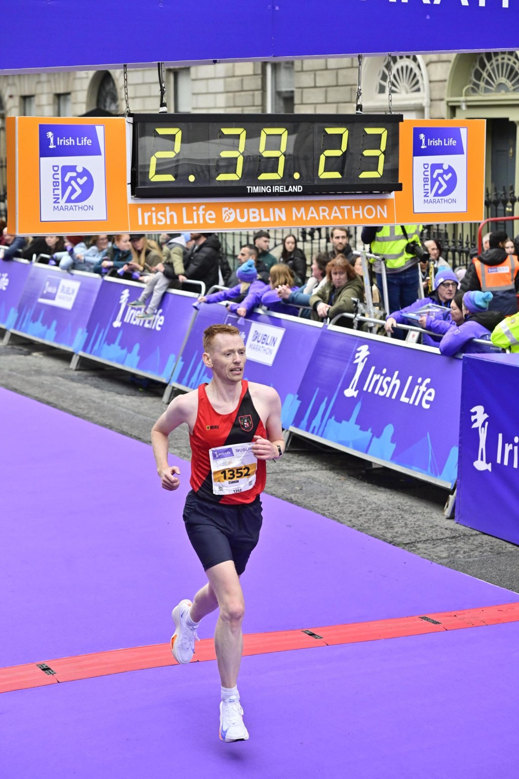 The last 2 miles of Dublin Marathon are fantastic. It is completely flat, the avenue is treelined and the supporters are out in their droves. It had been a while since I felt like I was full of running, at times I was just getting through it, but now I felt good. I was a little shocked that kilometre 40 was only a 3:50 as it did feel much faster, likely because I was fatigued or else because the bounce came midway through that kilometre. I wasn’t phased though. I was at the point in the race now where I knew I was going to finish, I was definitely going to PB and my goal was very much in sight. I don’t recall too much of the last mile, only that I was again moving through the field. It has since dawned on me that I can’t recall anybody passing me out once the race got going. All the guys I was coming upon here were on the struggle bus hard. Jonathan had put a little gap on me but he was coming back to me again. Before we crossed the canal, I was past him.